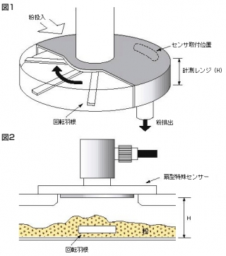 図1のようなテープル型の密閉容器に粉を投入する粉体装置において、静電容量式レベル計で粉面管理を行なうことにより、連続運転を可能にした納入例があります。
