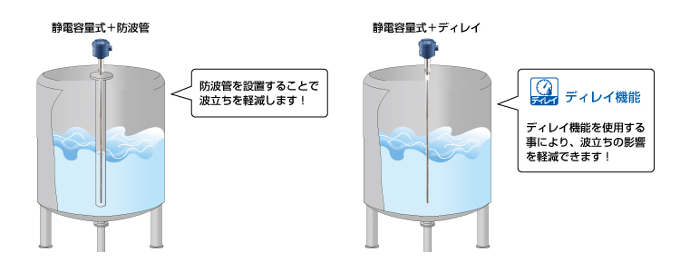また、波立ちの対策としては、ディレイ機能の他に防波管を使用することでも軽減が可能です。