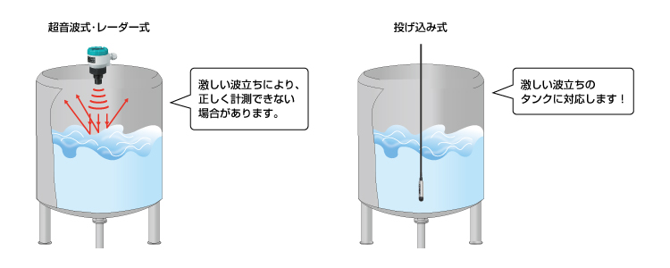 ご要望:工場内のタンクやピットの中には液体の投入や撹拌機の影響で「波立ち」が発生する箇所がいくつかあります。波立ちによってチャタリングが起こったり、誤計測したりする場合もあります。このような波立ちに対応するレベルセンサはありませんか?