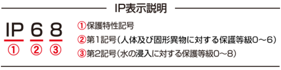 - 日本工業規格にて規定された防水防塵のランクによる等級。