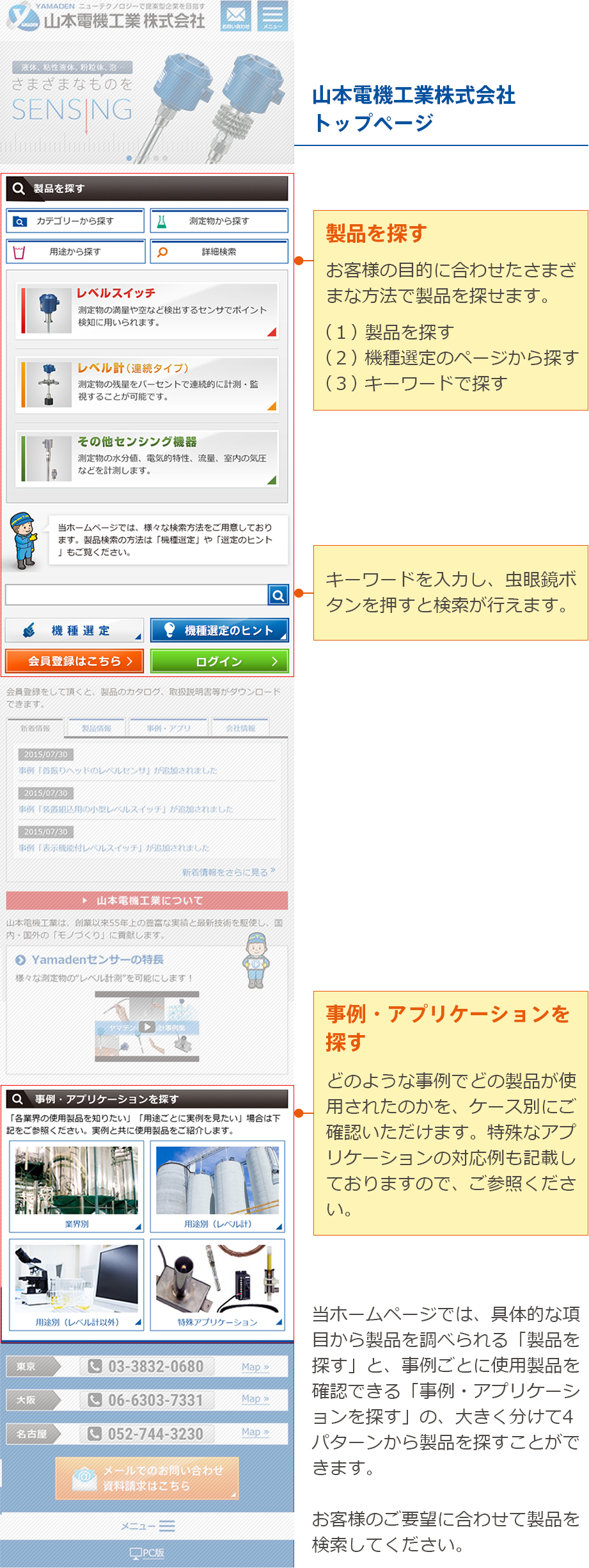 これまでの山本電機工業の事例や対応アプリケーションから、製品を探すことができます。