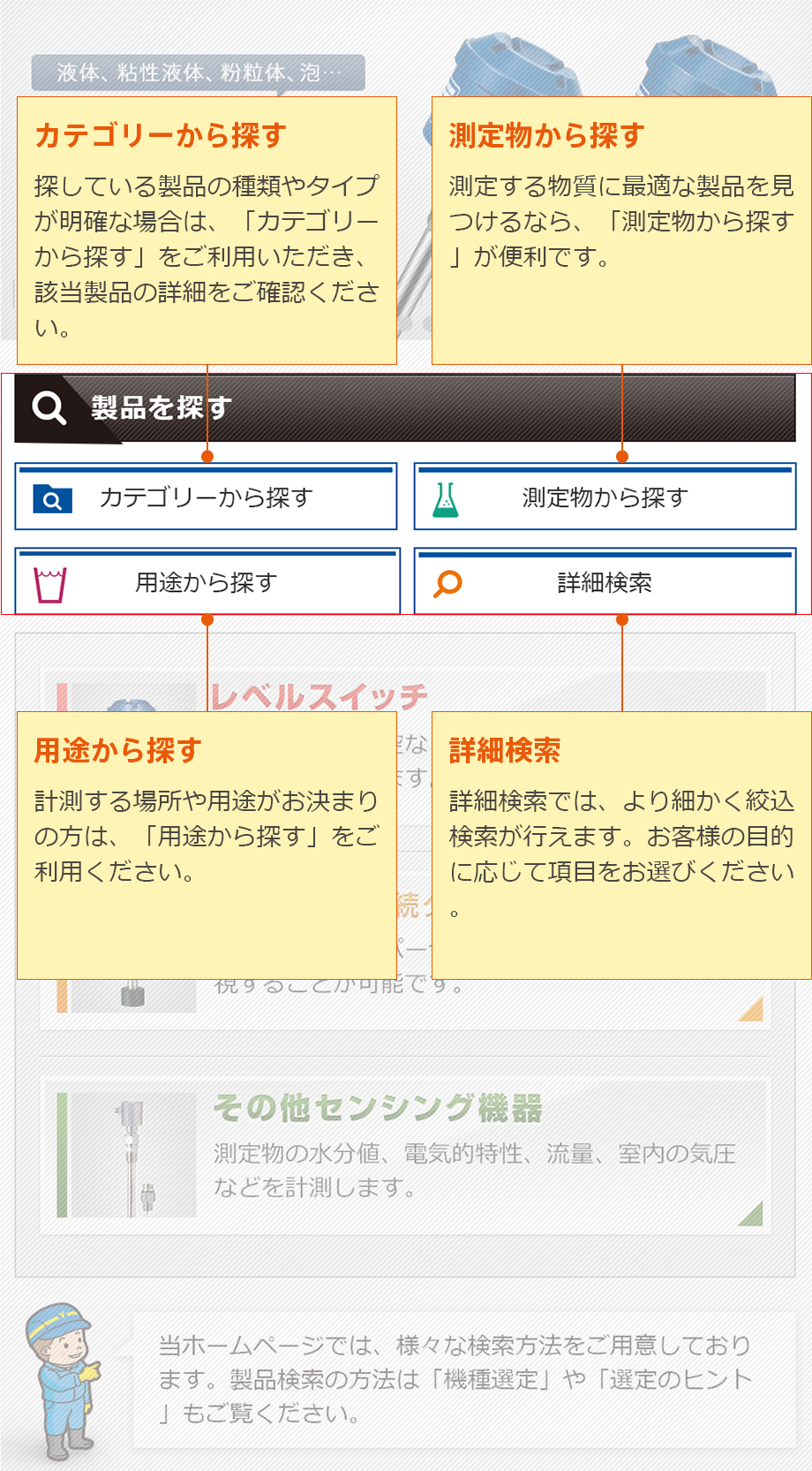 「カテゴリーから探す」「測定物から探す」「用途から探す」「詳細検索」の4つの方法をご用意しております。
