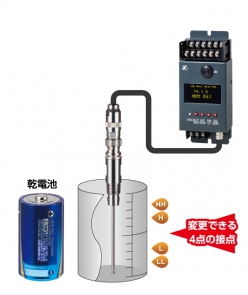 残量計測とは別に上限・下限等のポイント検出が可能です。任意の位置のHH、H、L、LLの4接点の出力が可能です。警報動作方向(上昇ON、下降ONなど)も変更が可能です。
